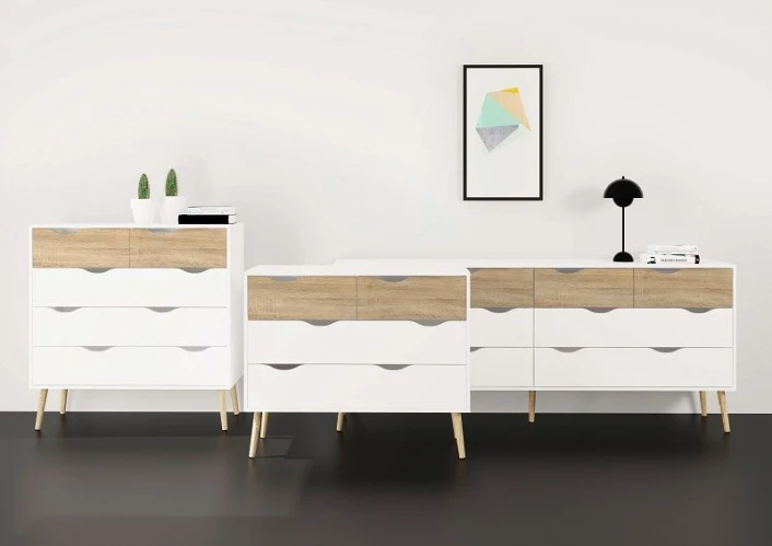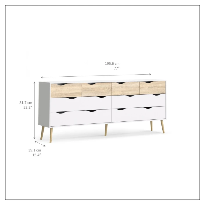 Moderne hvit skjenk. Designet er nordisk inspirert, som gjør skjenken veldig anvendelig. Den hvite fargen, kombinert med treet, skaper et flott utseende. Det organiske materialet skaper en hyggelig stemning i rommet. Skjenken inneholder, med sine otte skuffer masse god oppbevaringsplass.