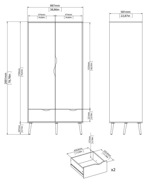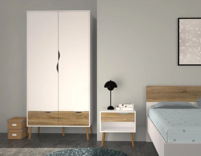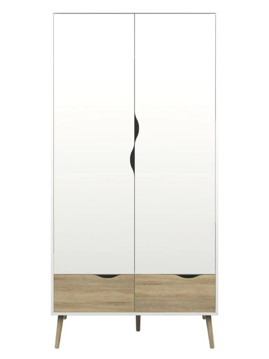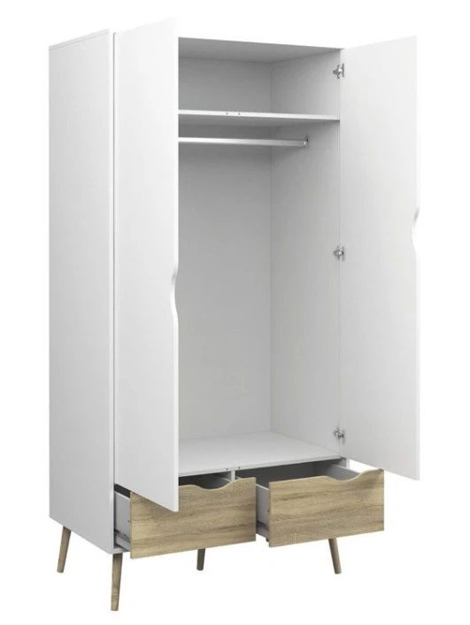 Fin og minimalistisk garderobeskap i hvit. Garderobeskapet har 2 luker med bøjleoppheng og 2 skuffer. Den flotte eiketrestrukturen kombinert med det hvite skapet et forfriskende og moderne design. Runde ben i massiv eik