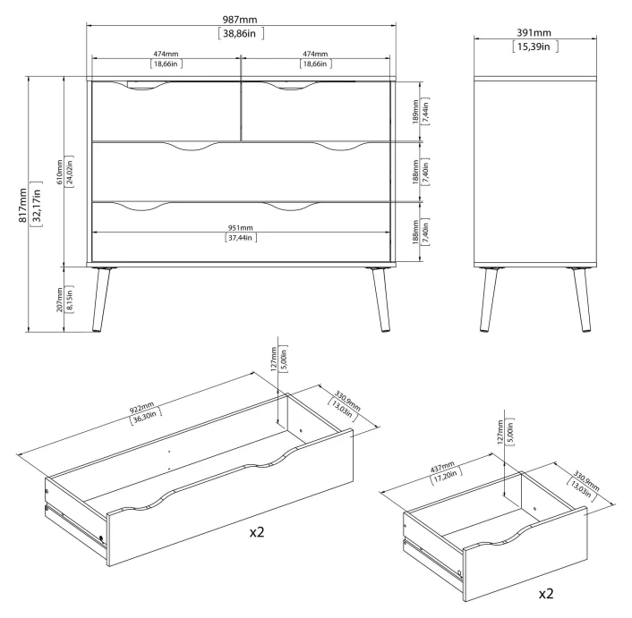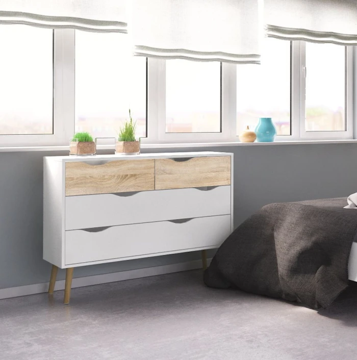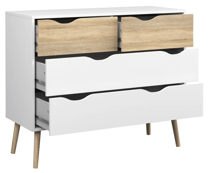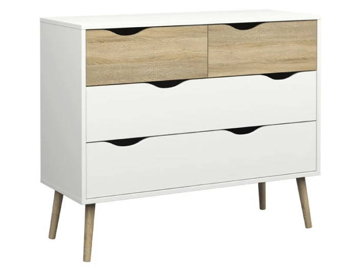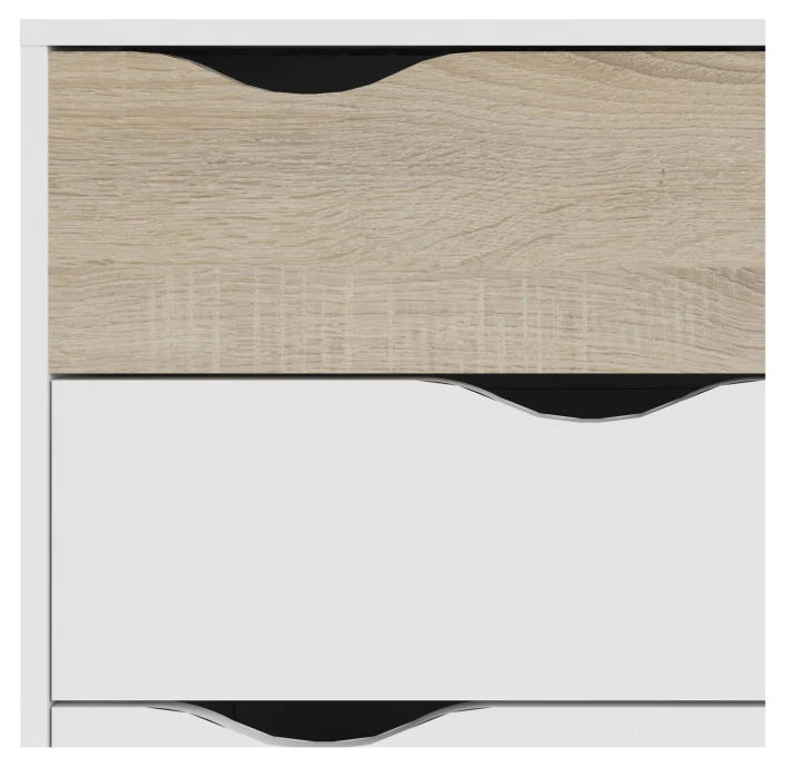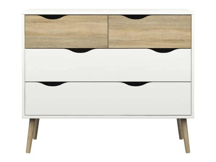 Fin og minimalistisk kommode med fire skuffer. Kommoden har et moderne design med den flotte eiketrestrukturen kombinert med det hvite. Dessuten har sengebordet noen flotte runde ben i massiv eik. Det er mulig å kjøpe til sengeramme, sengebord og garderobeskap i samme design