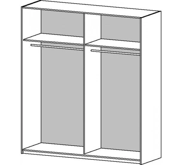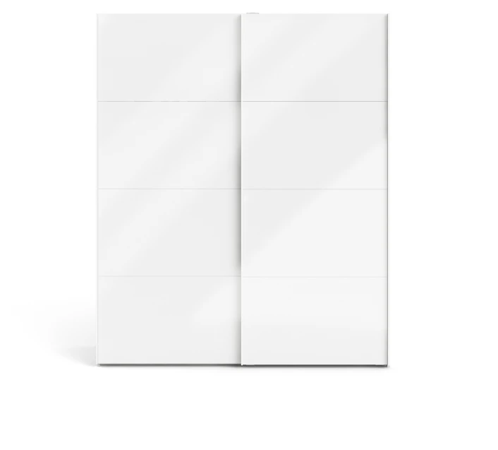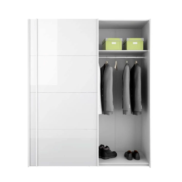 Hvitt garderobeskap med skyvedører i hvit høyglans. Bak dørene er det et rom til hengere med topplate på begge sider. Ekstra hylle og skuffeseksjon kan kjøpes separat. TV00512, TV00513, TV00514.