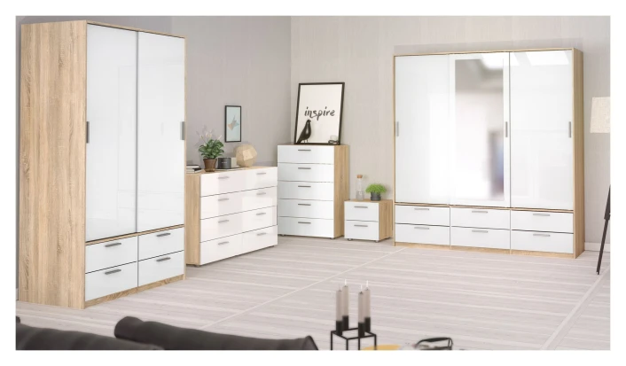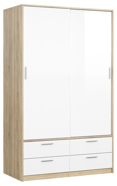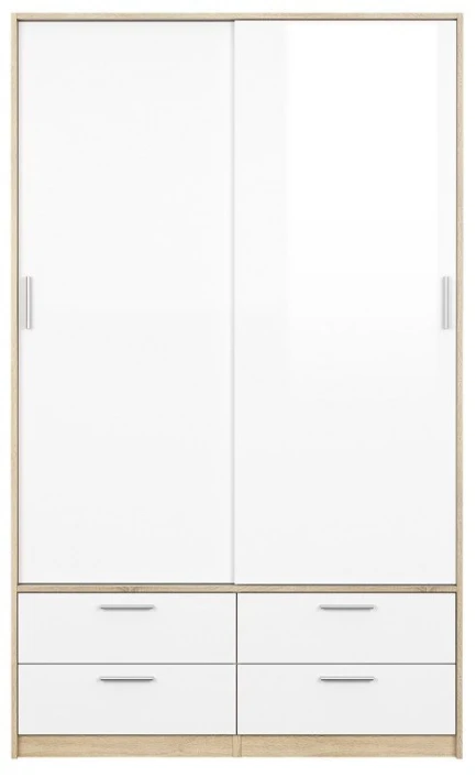 Moderne og stilig garderobeskap i eiketre med hvite dører og skuffer. Skapet har en klassisk stil og nøytrale farger, hvilket gjør at skapet passer godt inn i nordiske hjem. Bak de fine skyvedørene gjemmer det seg to store rom med masse plass til tøy og diverse. Garderoben inneholder også fire skuffer.
