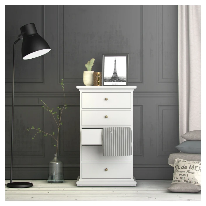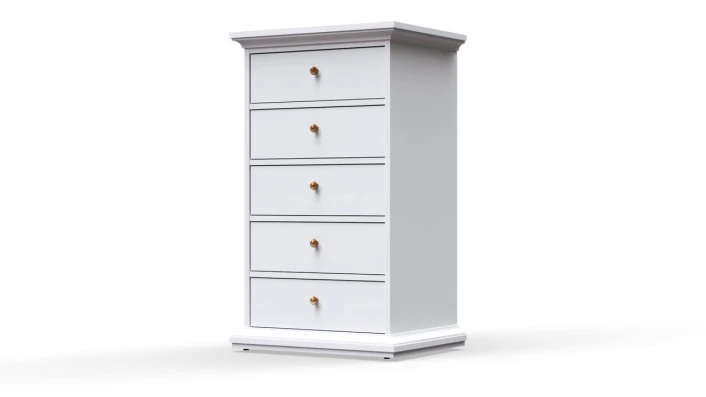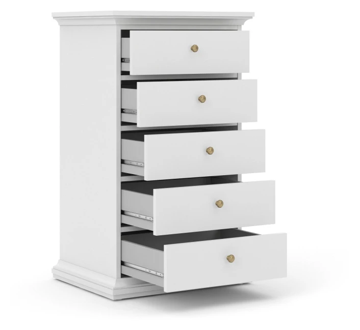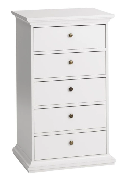 Nattbord i hvit. Bordet har fem skuffer med antikk-lignende metallgrep som fremhever det romantiske uttrykket.