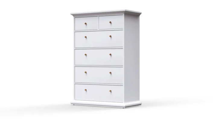 Hvit kommode i melamin. Kommoden har seks skuffer – to smale og fire brede – med antikk-lignende metallgrep som fremhever det romantiske uttrykket.