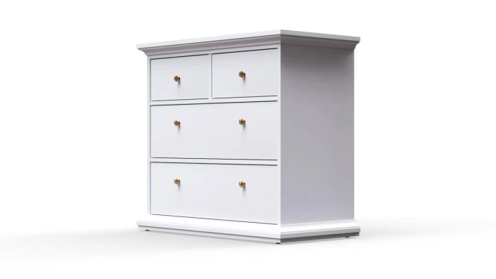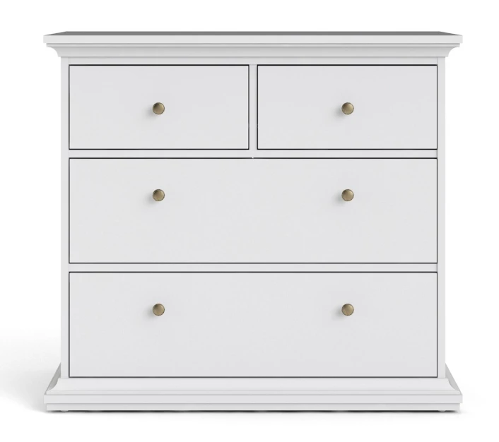 Flott kommode i hvit melamin med til sammen fire skuffer – to smale og to brede – med antikk-lignende metallgrep som fremhever det romantiske uttrykket. Den fine kommoden er flott både til entréen, mellomgangen og soverommet – det er mange muligheter!