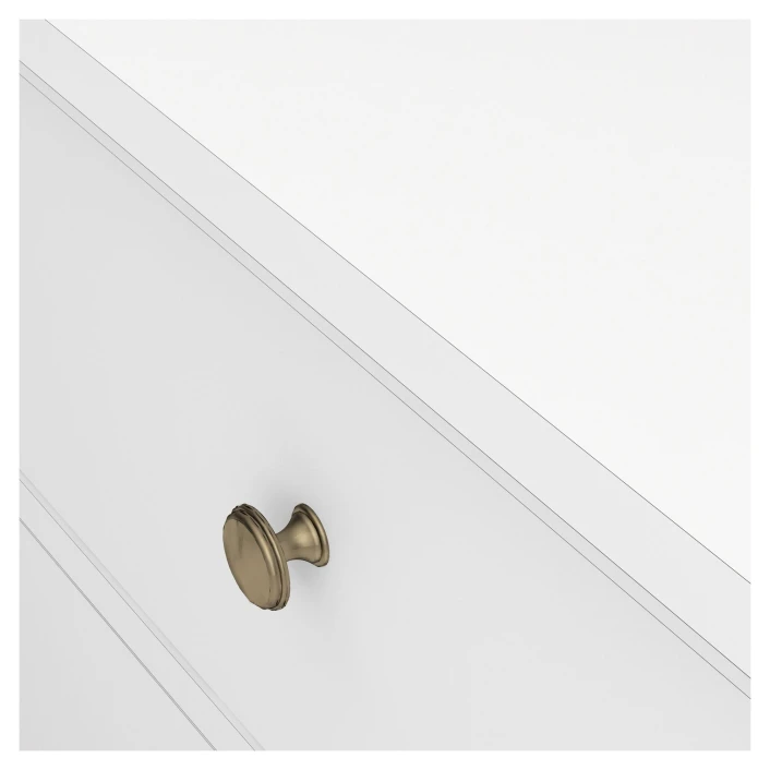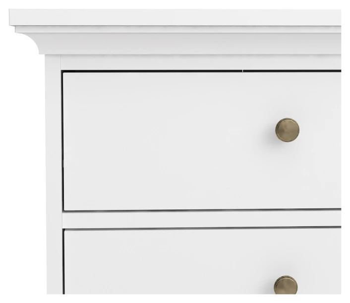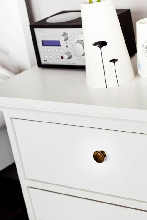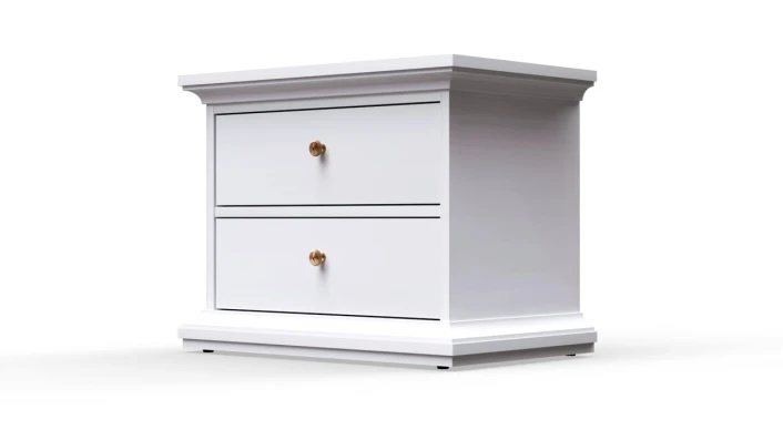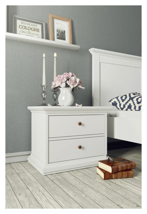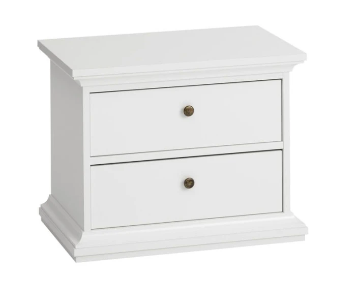 Nattbord i hvit. Bordet har to skuffer med antikk-lignende metallgrep som fremhever det romantiske uttrykket.
